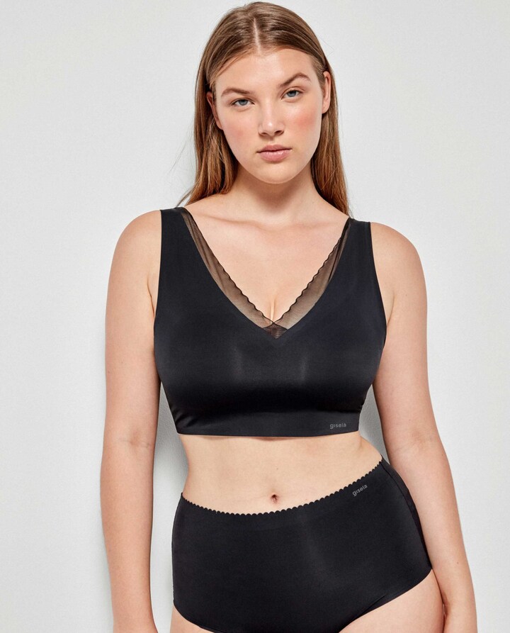 Soutien sem aro e com foam em tecido com acabamentos termofusionados sem costuras e detalhe de galão de renda no decote que não marca. Costas descobertas e fecho posterior de quatro posições. Combina-o com a sua cueca a condizer.
