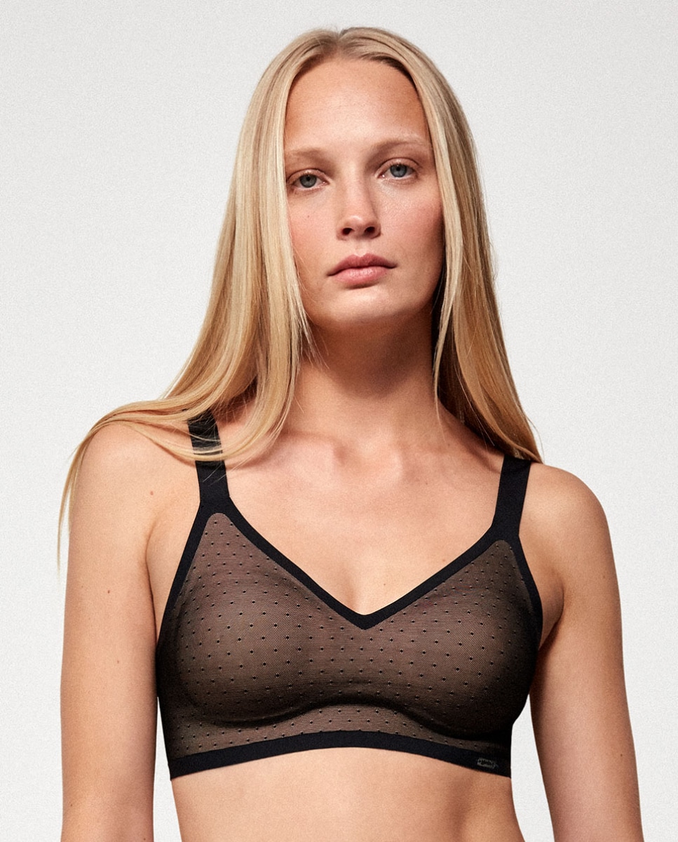 Soutien capacidade sem aro e com copa amovível para responder às necessidades de cada momento. Tecido plumetti delicado e feminino, aderido a outro de microfibra que se adapta ao corpo. Costas anatómicas para minimizar irregularidades. Acabamentos invisíveis e termofusionados que não marcam, e garantem um grande conforto.