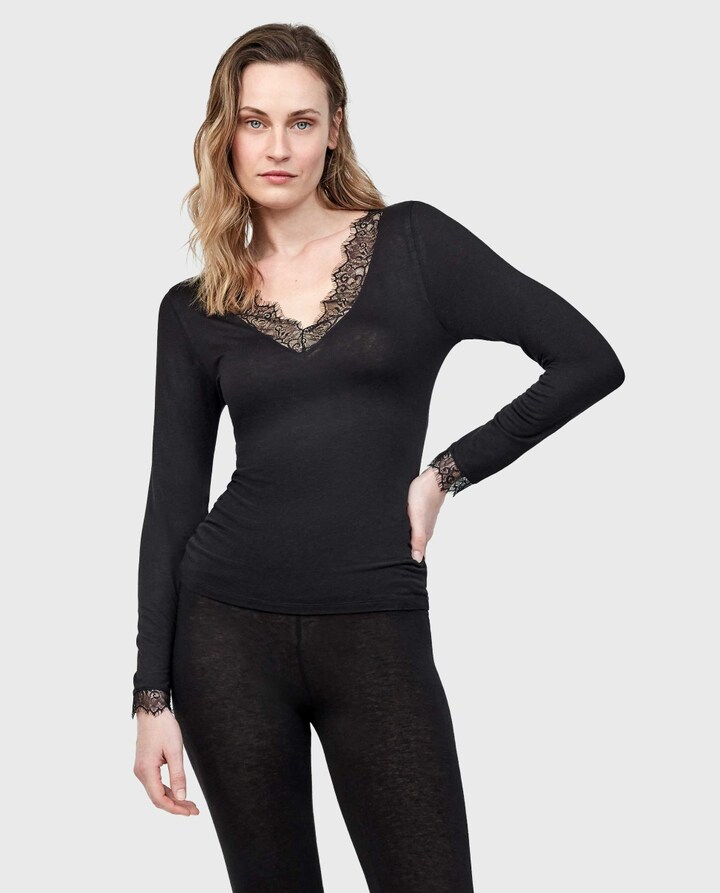 T-shirt leve de gola em V e manga comprida. Tecido fino, suave e quente com mescla de lã e viscose. Detalhes de renda na gola e punhos que aporta feminilidade. Caráter versátil para usar tanto em interior como em exterior.