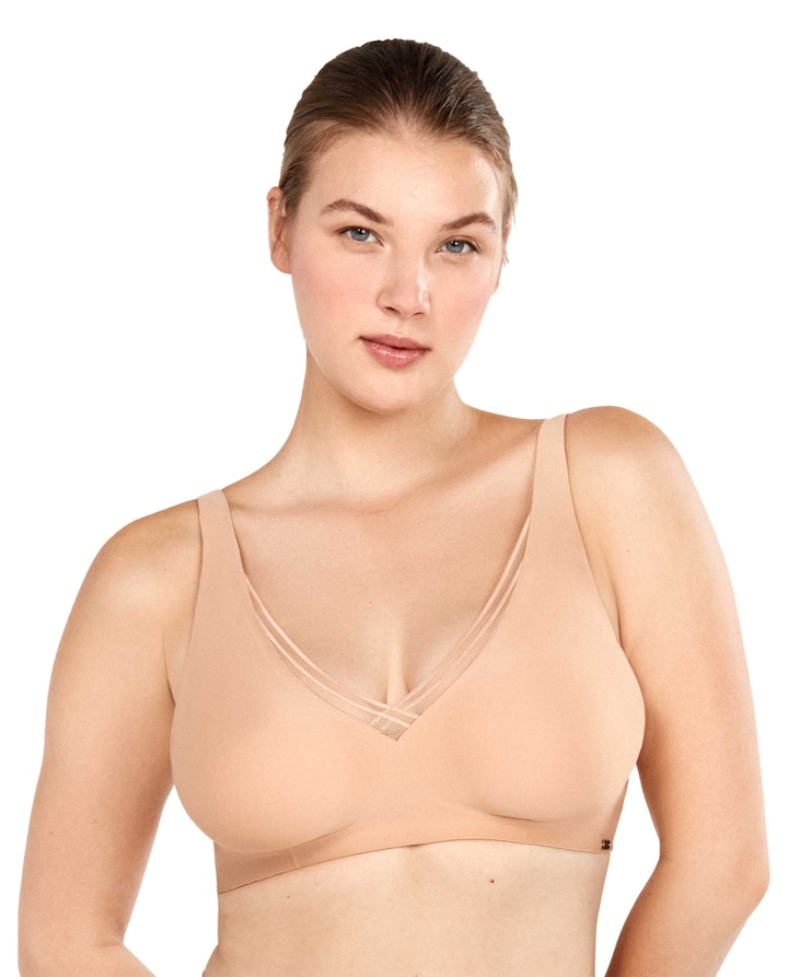 Soutien redutor sem aros minimiza de forma visível o volume do peito em um tamanho, proporcionando uma silhueta visualmente mais equilibrada sem renunciar ao conforto. Suas alças reguláveis e a opção de costas cruzadas permitem uma adaptação perfeita ao seu dia a dia. O rendado delicado aporta um toque feminino, enquanto as costas termofusionadas se fundem com a pele para um acabamento invisível sob a roupa. Ideal para quem busca suavizar o volume com elegância e leveza.