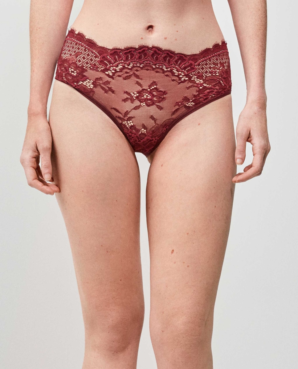 Cueca alta em tecido de renda floral. Por razões de higiene não se admite troca nem devolução deste artigo.