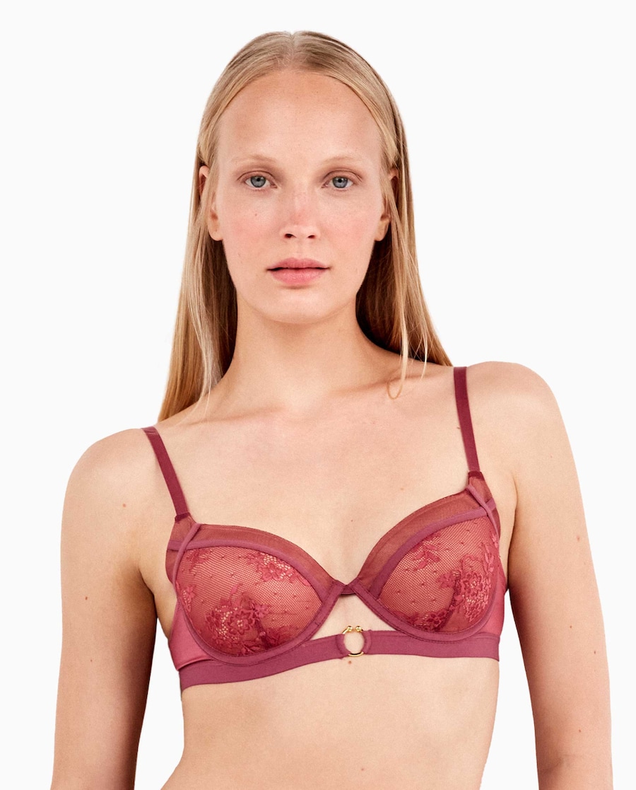 Soutien com capacidade all-over de renda extraplano floral e microfibra de cetim e detalhe peça metálica no centro do peito. Disponível em bordeaux e preto e em copas B, C e D.