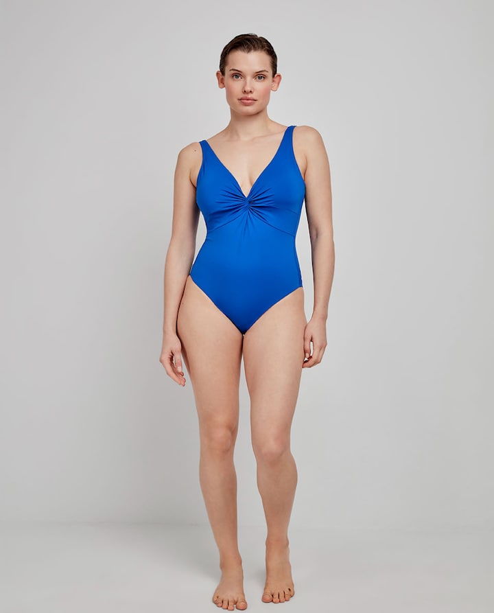 Fato de banho de mulher plus size e efeito control sem aro e com foam. Detalhe de nó no decote que estiliza a zona e alças reguláveis. Disponível em duas cores.