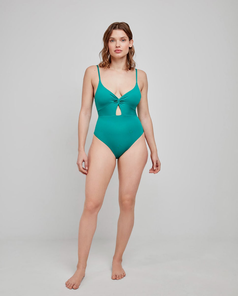 Fato de banho de mulher sem aro e com foam em tecido liso e detalhe cruzado no decote e cut outs frontais.