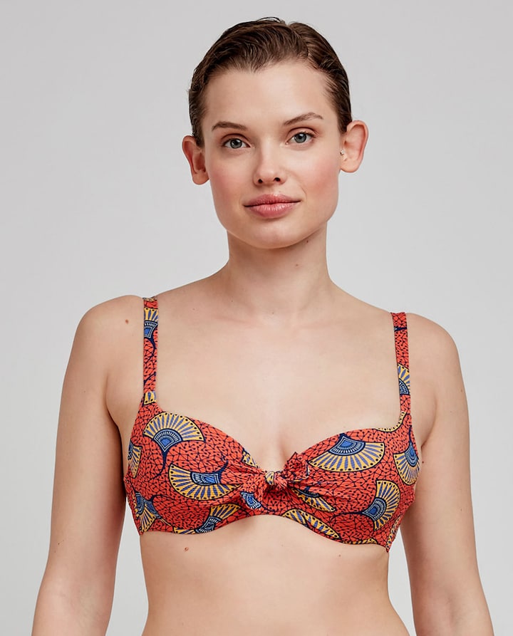 Top de biquíni com capacidade, aro e foam em tecido de estrutura e estampado tribal. Detalhe laço no decote que estiliza a zona. Alças reguláveis e fecho posterior. Combina-o com a sua cueca a condizer.