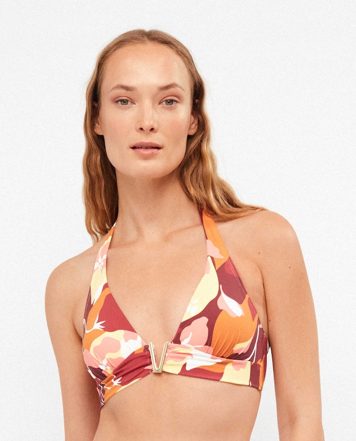 Top de biquíni triangular de copa fixa, sem aro e peça metálica em V no decote. Alças reguláveis e fecho nas costas. Em tecido estampado geométrico.