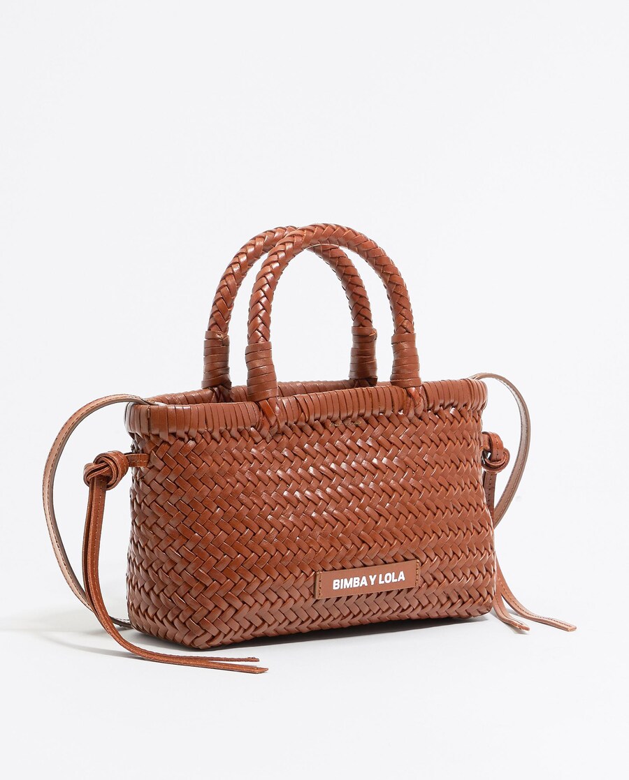 Shopper de pele em honey. Modelo com fecho de botão de pressão. Exterior personalizado com logo gravado BIMBA Y LOLA.