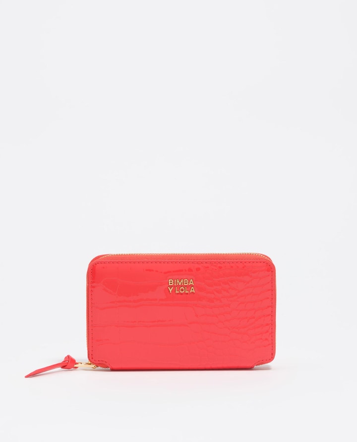 Carteira de mulher BIMBA Y LOLA com textura e fecho de correr, confecionada em material sintético. Apresenta um design em laranja com tonalidades secundárias em coral e uma superfície lisa. Esta carteira pertence à coleção de Outono-Inverno 2025 e está dirigida ao público feminino. A composição do material é de 58% poliéster e 42% poliuretano. As suas dimensões são de 15 cm de altura, 9 cm de comprimento e 2 cm de largura.
