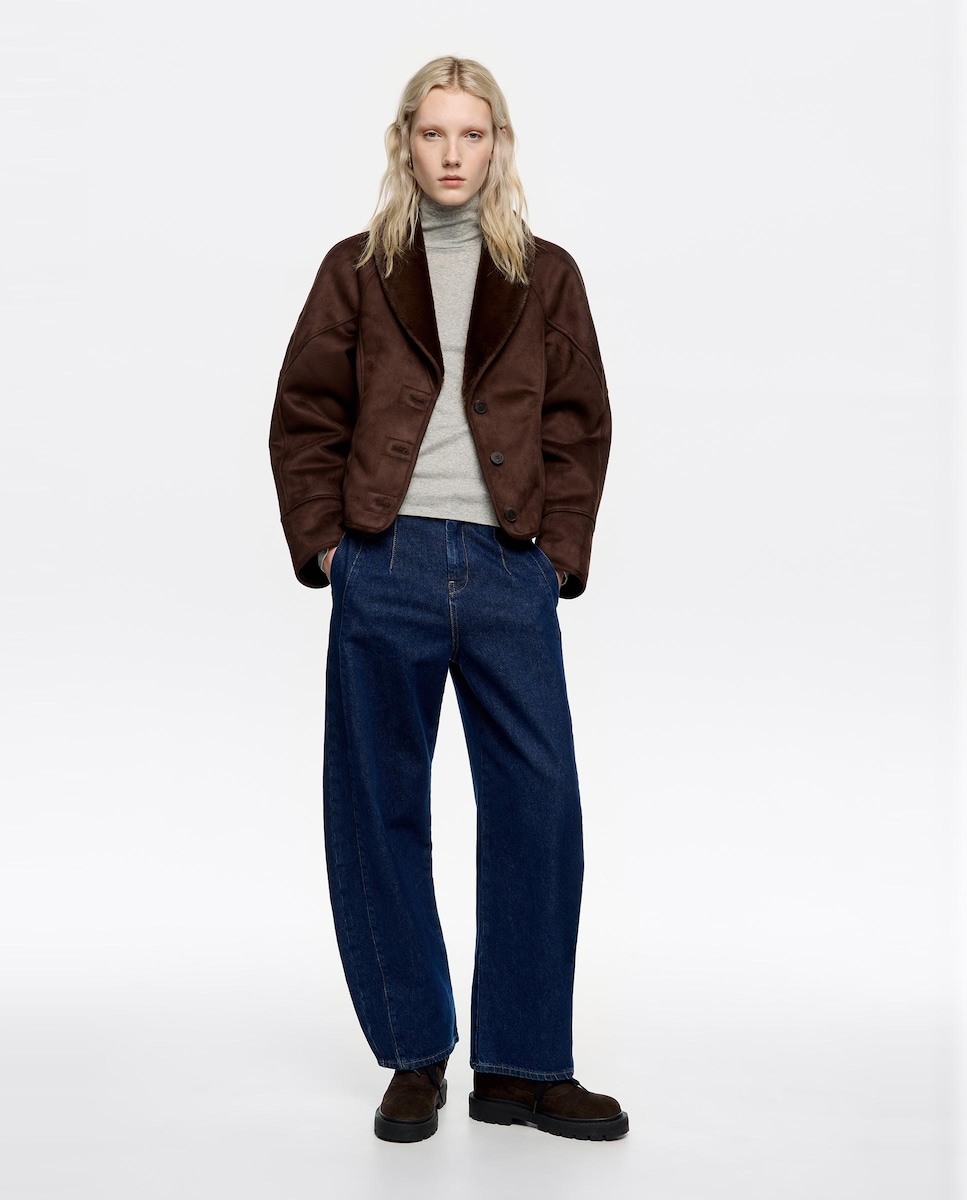 Blusão curtoCorte a direitoBotões frontaisDecote com lapelaManga comprida e a direitoBolsos de vivoInterior de pelo em tom.