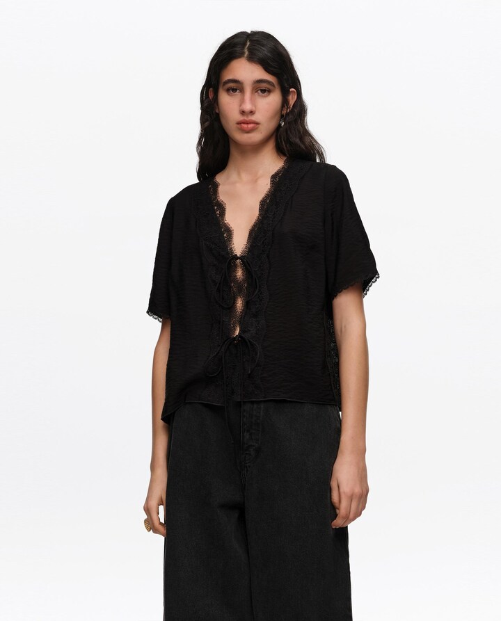 Descobre a elegância da camisa de Bimba y Lola, desenhada com um corte a direito que realça a figura feminina. Os seus cordões de tecido na parte frontal e o decote em V pronunciado adicionam um toque distintivo, enquanto as mangas curtas e os delicados rendas na parte frontal e as aberturas laterais oferecem um ar sofisticado. Confecionada em uma suave mescla de viscose e poliamida, esta peça é perfeita para qualquer ocasião. Ideal para combinar com os teus looks mais variados.