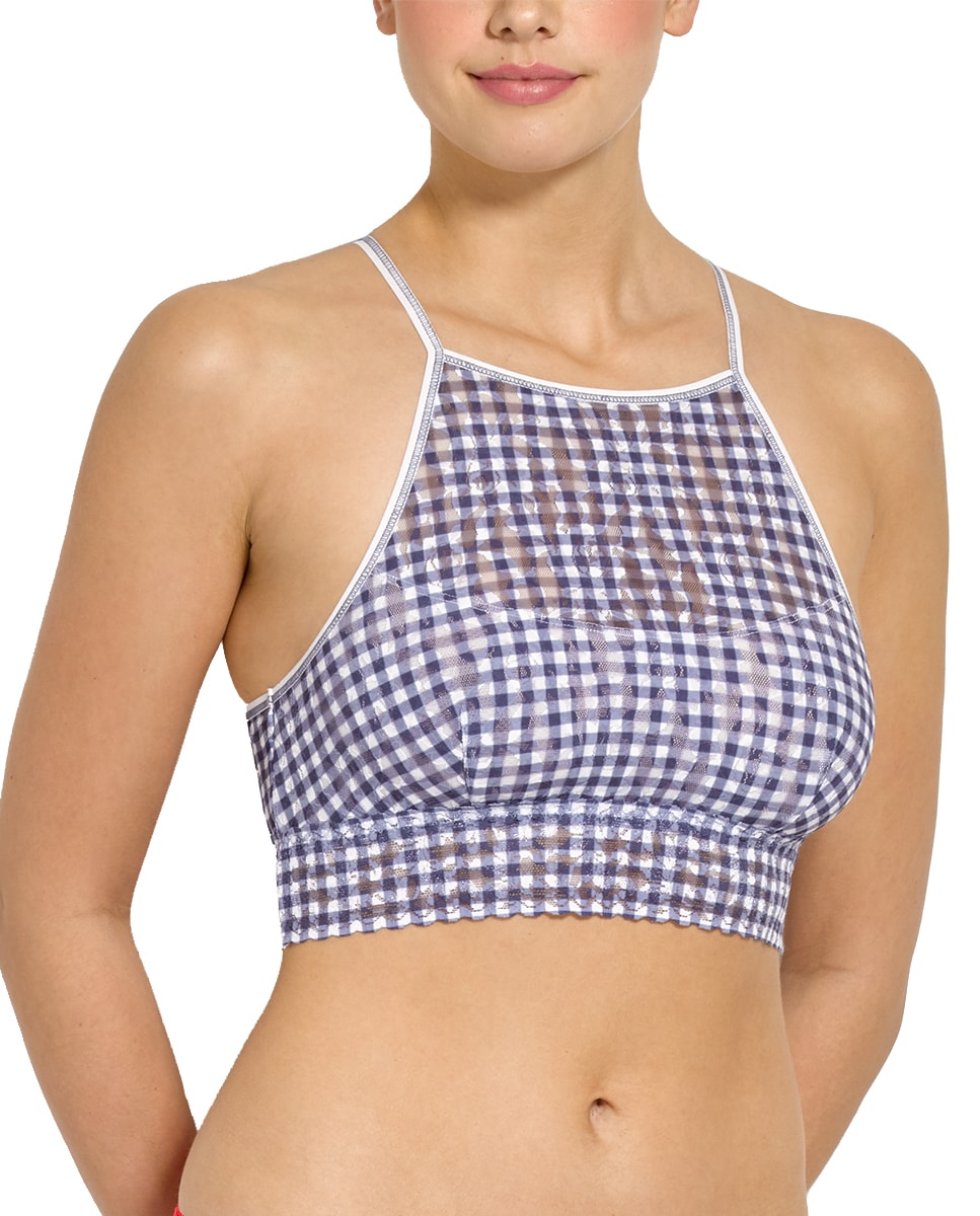 Top de renda suave e elástica de corte abaixo do peito. Com um favorecedor decote halter e um leve forro na parte frontal para que o soutien seja opcional. Costas cobertas e sem fecho posterior para um maior conforto. 100% Made in USA.