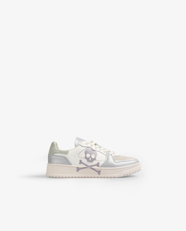 Sapatilhas retro. Sneakers confecionadas em 100% pele. Fecho com atacadores em tom, sola de TPR e maxi caveira lateral. Detalhes em camurça.