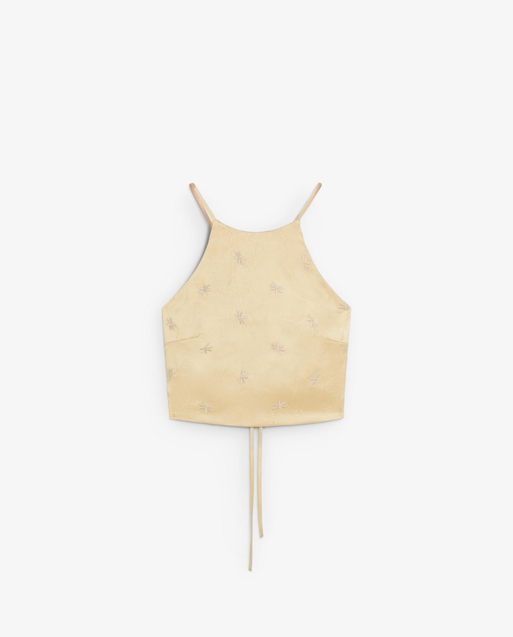 Top confecionado em tecido acetinado com bordados florais em tom. Regular fit, crop length. Decote halter e alças cruzadas nas costas reguláveis. Costas abertas com fecho de cordão.