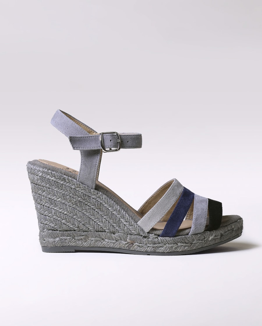 ALEN-A de Toni Pons. Alpercatas para mulher elaboradas em camurça de cores contrastadas e com forro têxtil. O cunha tem uma altura total de 9cm, dos quais 7 cm pertencem ao tacão e 2 cm à plataforma e está feita de juta e borracha. A planta interior está forrada em tecido com uma suave palmilha de pele que lhe confere grande conforto. ALEN-A faz parte da coleção Essencial de Toni Pons e é a reinvenção da sandália clássica, muito confortável e com uma perfeita altura. Sua tira em forma de pulseira no tornozelo com fecho de fivela lhe confere total estabilidade e suporte ao pé. Uma alpercata perfeita para adicionar elegância aos seus looks, sem renunciar ao conforto.