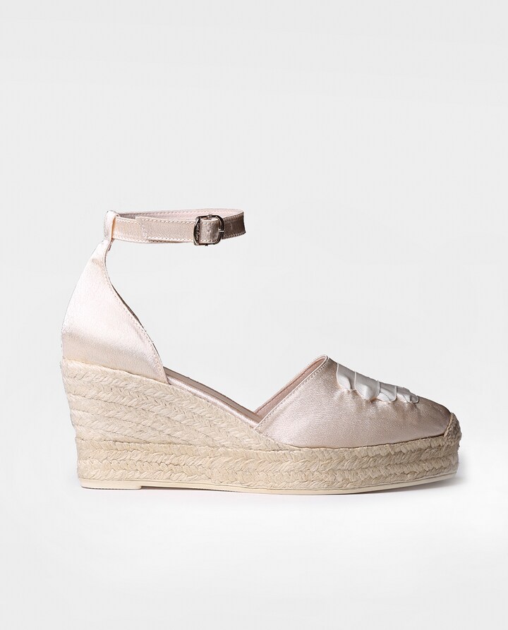 AYLA de TONI PONS é uma alpargata de noiva para mulher elaborada em cetim. O cunha de juta tem uma altura total de 7 cm, dos quais 2,5 cm são de plataforma e 4,5 do tacão. A base da sola é de borracha antiderrapante. A sola interior está forrada em tecido com uma suave palmilha de pele que lhe confere um grande conforto. Trata-se do design clássico de alpargata fechada na parte superior do pé com fecho de pulso ajustado ao tornozelo para uma maior sustentação. Este modelo calça o tamanho habitual, se estiver entre dois tamanhos recomendamos escolher o menor.