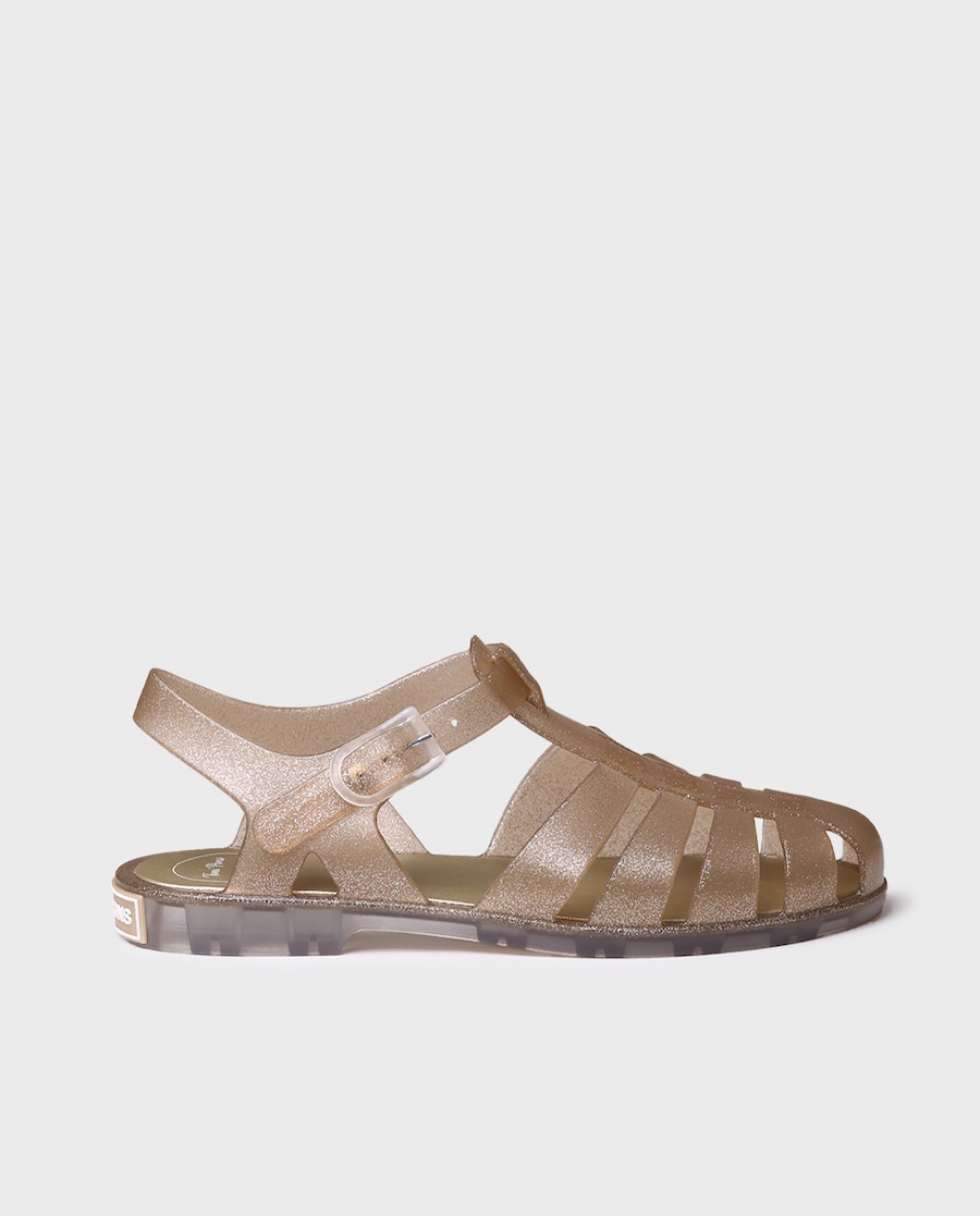 CALA. Estas sandálias de borracha para mulher estão disponíveis com um acabamento de purpurina. Têm um fecho lateral ajustável com fivela. Estas sandálias de água têm uma palmilha interior de borracha. É um modelo vegano e impermeável. Este modelo calça o tamanho habitual, se estás entre dois tamanhos recomendamos escolher o mais pequeno.