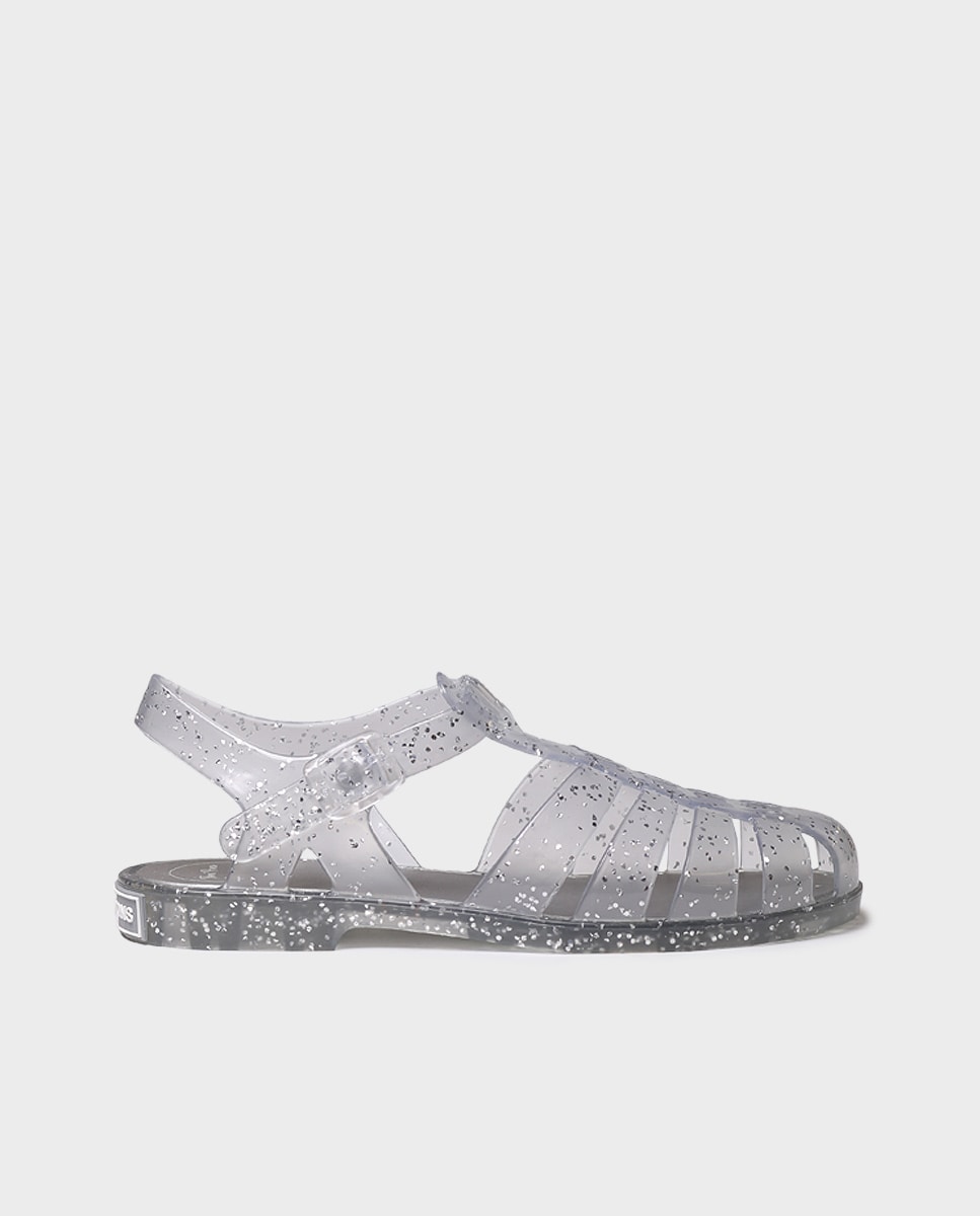 CALA. Estas sandálias de borracha para mulher estão disponíveis com um acabamento de purpurina. Têm um fecho lateral ajustável com fivela. Estas sandálias de água têm uma palmilha interior de borracha. É um modelo vegano e impermeável. Este modelo calça o tamanho habitual, se estás entre dois tamanhos te recomendamos escolher o mais pequeno.