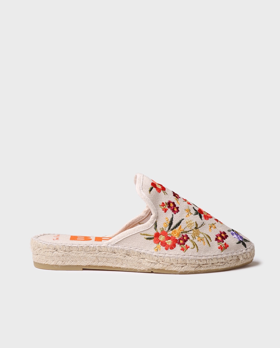 CULIP. Estas alpercatas destalonadas de mulher são elaboradas em tecido bordado com cores vivas. A sola de juta é plana e a base é de borracha antiderrapante. A planta está forrada em tecido de algodão com uma palmilha acolchoada que proporciona conforto ao pé. Este design está cosido à mão em Espanha. Trata-se de um modelo vegano. Se estás entre dois tamanhos, recomendamos escolher o maior.