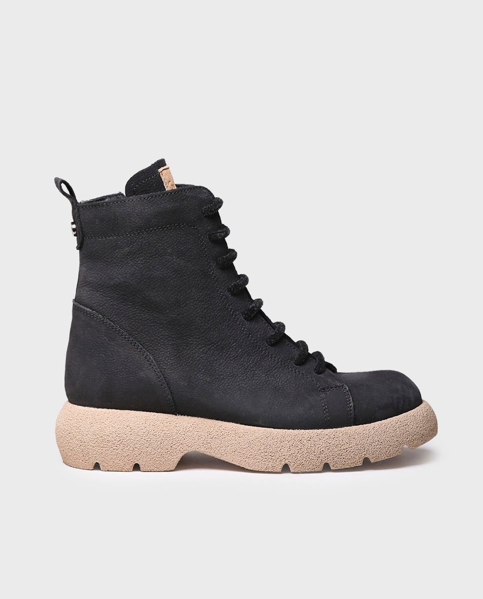 DASHA. Este botim com atacadores para mulher está elaborado em pele nobuk em tons lisos. A sola contrastante é de borracha antiderrapante. Tem uma altura total de 4,5 cm. A palmilha interior está forrada em tecido respirável e está acolchoada para maior conforto. Este modelo calça o tamanho habitual, se estás entre dois números, escolhe o mais pequeno.