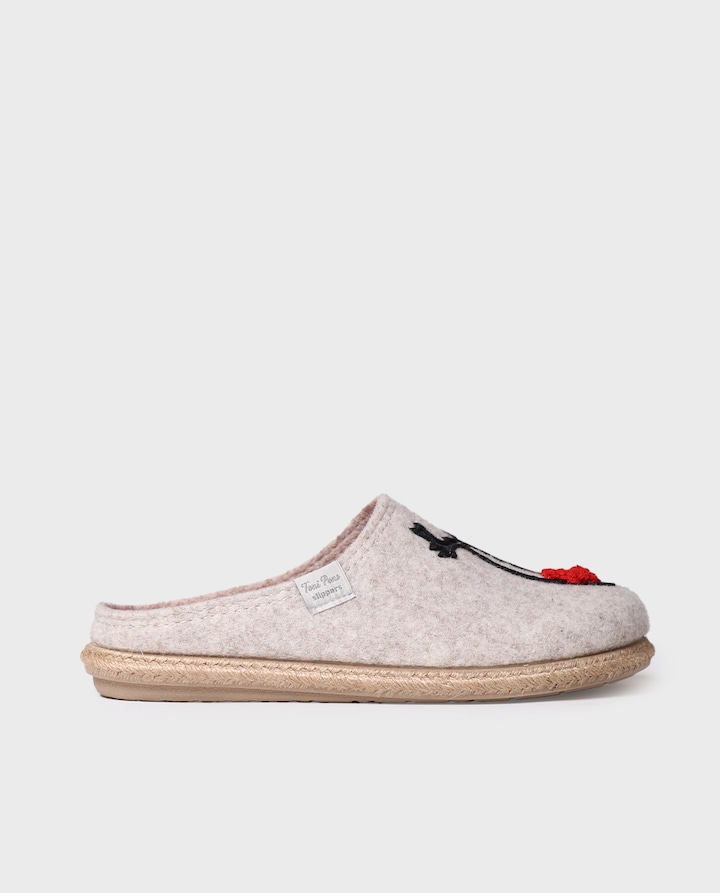 DELI-DR. Estas pantufas abertas para mulher estão feitas em feltro com motivos natalícios bordados. A sola é plana e tem 1 cm de espessura e está feita de borracha antiderrapante e trança de juta. Conta com uma palmilha removível com uma cunha de 2 cm na parte do calcanhar. Este modelo calça o tamanho habitual; se estás entre dois números escolhe um tamanho mais pequeno. Não é aconselhável lavar as slippers na máquina. Recomendamos consultar a guia de cuidados para saber como mantê-las.