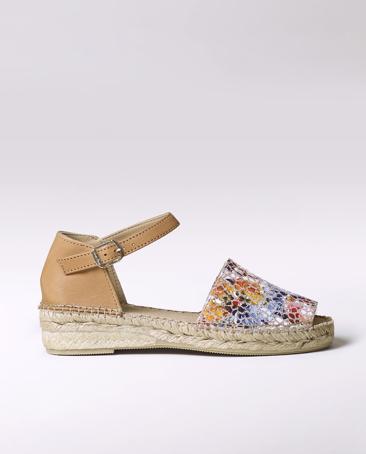 ELGIN-PM de Toni Pons. Alpercatas para mulher elaboradas em pele com um estampado de cores vivas na parte frontal. O cunha tem uma altura total de 3,5 cm dos quais 1,5 cm pertencem ao tacão e 2 cm à sola e está feita de juta e borracha. A planta interior está forrada em tecido. A união do couro e da sola está cosida à mão com um fio de algodão. ELGIN-PM é um modelo de alpercata versátil, pode usá-lo em qualquer ocasião. O calcanhar de pele e o fecho de pulso ajustável lhe dá um toque de elegância e sofisticação.