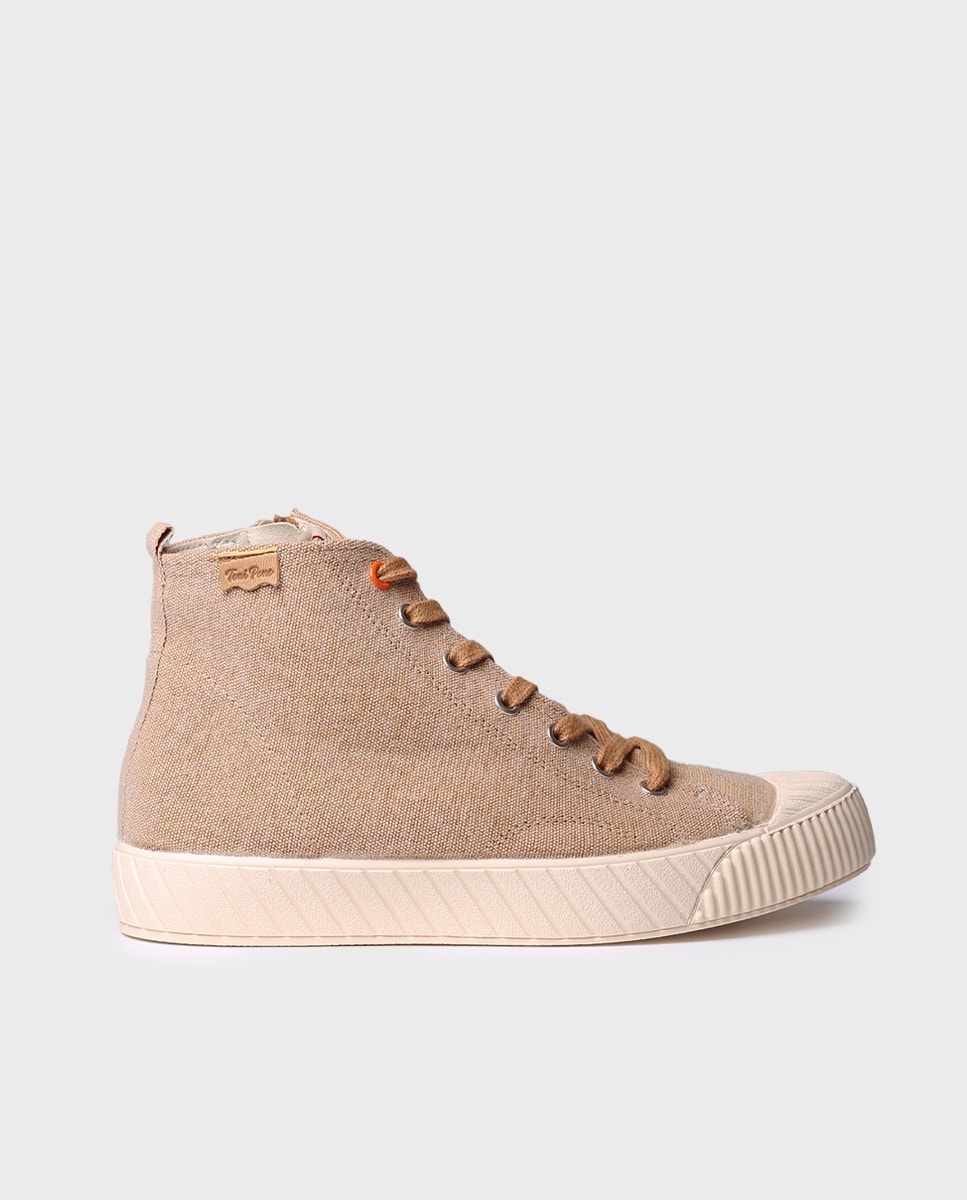 GENA-MI. Estas sapatilhas altas de mulher estão elaboradas em tecido reciclado com detalhes brilhantes em glitter. A sola é plana, tem 3 cm de espessura e está feita de borracha, leva um reforço de borracha na biqueira para maior durabilidade. A palmilha interior está forrada em algodão. Este modelo abotinado ata-se com atacadores para assegurar um ajuste perfeito ao pé. É 100% vegano. Este modelo calça o número habitual, se estiver entre dois números escolha um número mais pequeno.