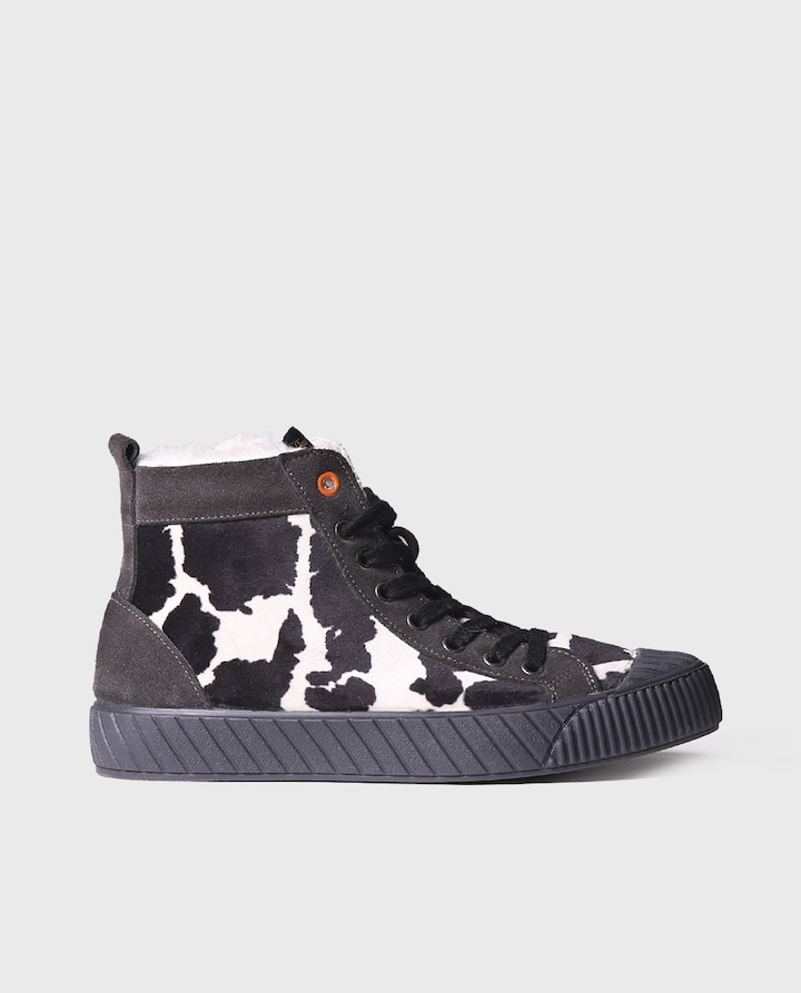 GEVA-FT da Toni Pons. Sapatilhas para mulher elaboradas em camurça com print animal. Possui um forro interior de borreguito para dar aquecimento no inverno. A sola é plana, tem 2,5 cm de espessura e está feita de borracha, assim como a biqueira. A palmilha interior é removível e está forrada em tecido respirável para maior conforto. Este modelo calça o tamanho habitual; se estiver entre dois números escolha um tamanho maior.