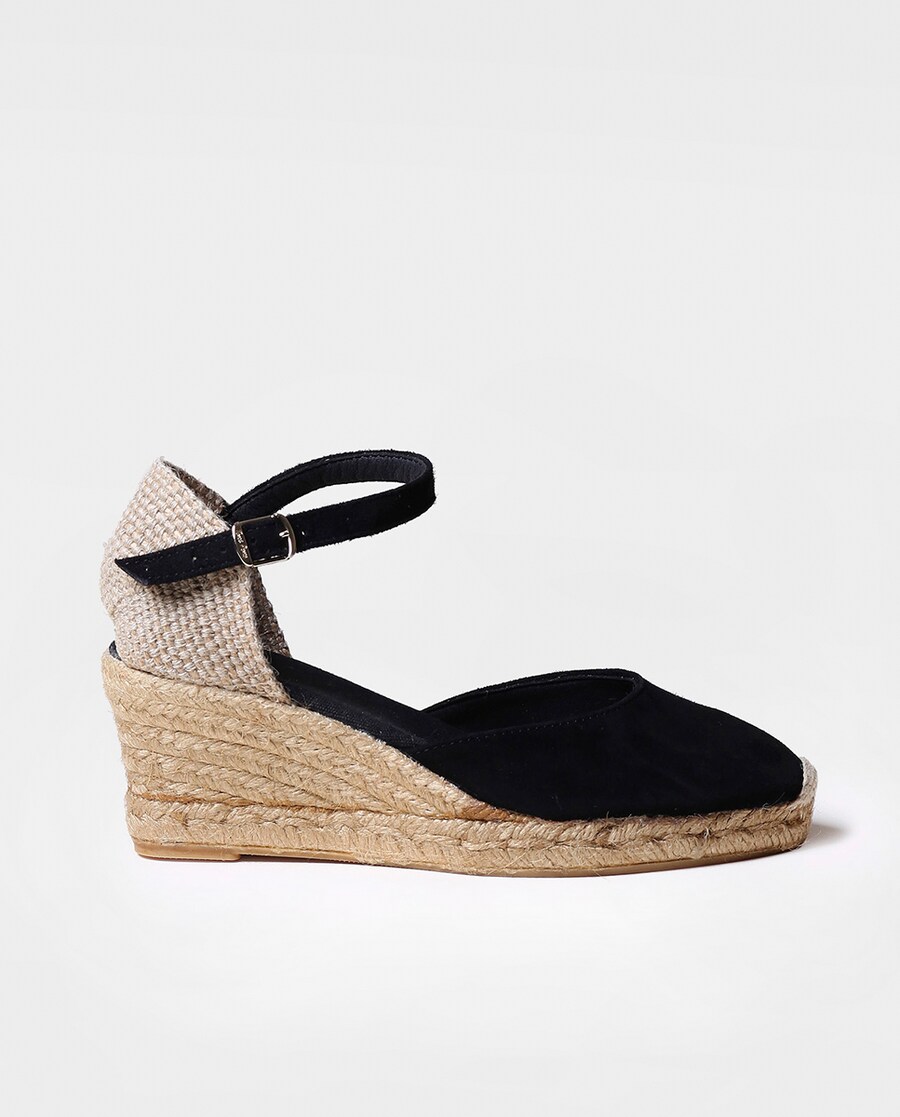 Lloret-5. Estas alpercatas em camurça são confecionadas em tons lisos. A cunha de juta tem uma altura total de 7 cm, dos quais 5 cm pertencem ao salto e 2 cm à plataforma. A base da sola é de borracha antiderrapante e a sola interior está forrada em tecido de algodão. O contraforte está elaborado em tecido entrançado e dispõe de fecho de pulseira com fivela. A biqueira do sapato é fechada. Este modelo calça o tamanho habitual, se estiver entre dois tamanhos recomendamos escolher o maior.