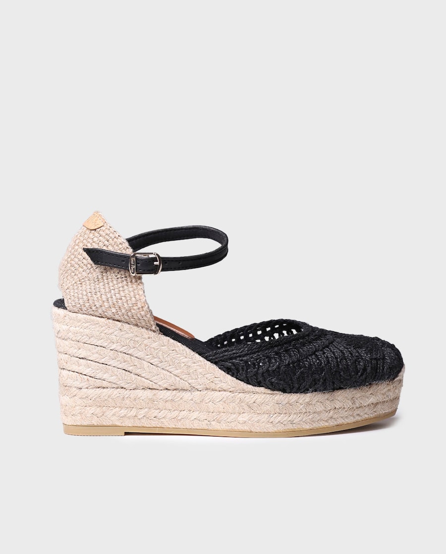 LOVINA. Estas alpargatas com cunha para mulher estão feitas em tecido tipo crochê. A cunha de juta tem uma altura total de 7 cm, dos quais 4,5 cm pertencem ao tacão e 2,5 cm à plataforma. A base da sola é de borracha antiderrapante. A planta interior está forrada em tecido respirável para um maior conforto. O calcanhar é elaborado em tecido trançado e dispõe de fecho de pulso com fivela. A união do tecido e da sola está cosida à mão com um fio de algodão e tem um reforço na ponta. Este modelo calça o tamanho habitual, se estiver entre dois tamanhos recomendamos escolher o maior.