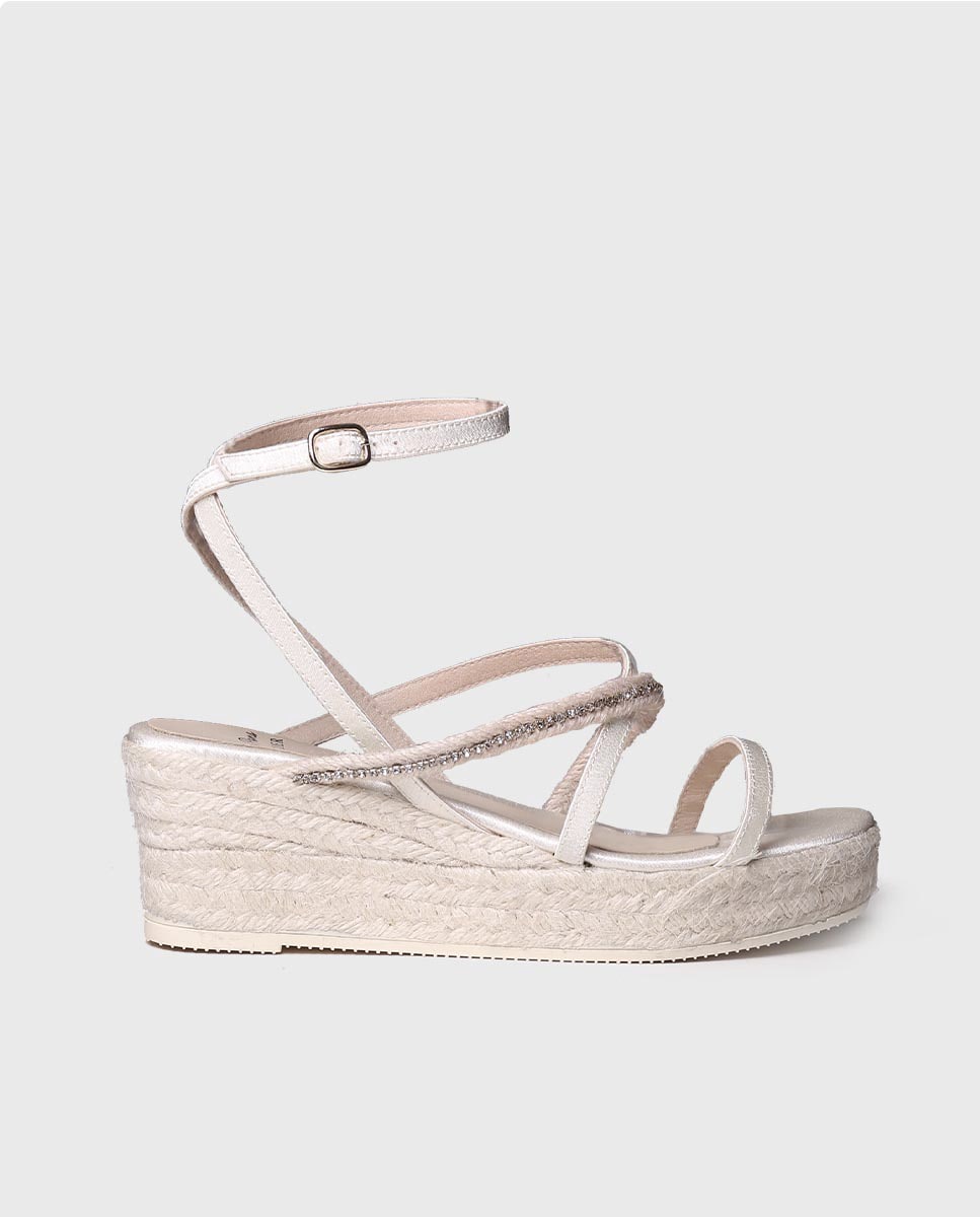 LUBA. Estas alpargatas brancas de noiva são elaboradas em tecido. Trata-se de um design aberto com umas finas tiras de tecido acetinado. A sola interior é de acetato com uma palmilha de pele para aportar maior conforto. Dispõe de um fecho de fivela ajustável para garantir um correto ajuste ao pé. A sola de juta tem uma altura total de 5 cm, 2 cm dos quais pertencem à plataforma e 3 cm ao tacão. Este modelo calça o tamanho habitual, se estás entre dois tamanhos recomendamos escolher o maior.
