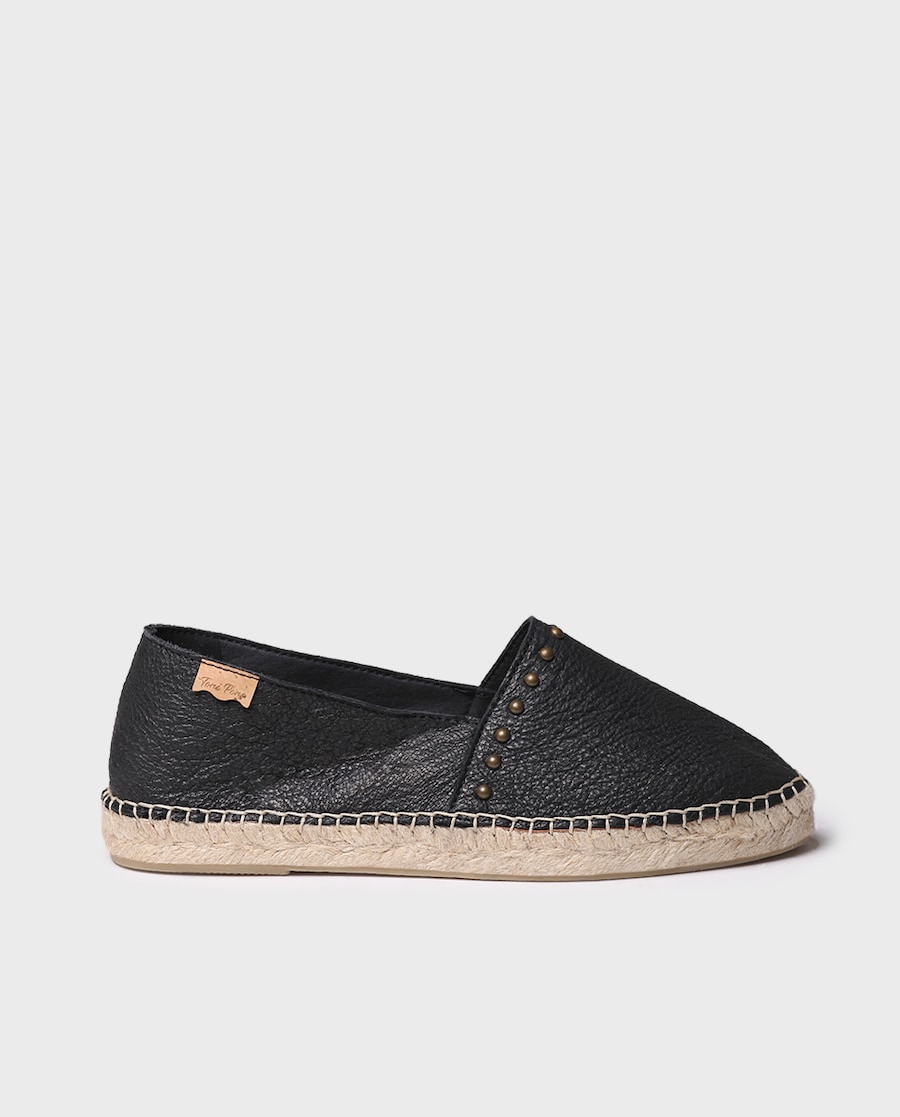 MALTA. Estas alpargatas planas de mulher são elaboradas em pele em tons lisos e dispõem de um detalhe de tachas na parte superior. A sola de juta tem uma altura total de 1,5 cm. Conta com uma palmilha interior acolchoada de tecido respirável e a base é de borracha antiderrapante. Este design está cosido à mão em Espanha. Estas alpargatas estão feitas com pele natural. As variações de cor e textura são intencionais e resultado de um acabamento artesanal. Este modelo calça o tamanho habitual, se estiver entre dois tamanhos recomendamos escolher o maior.