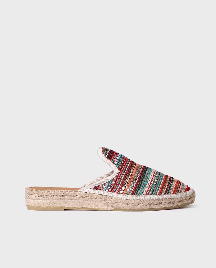 ODET-CH. Estas alpargatas destalonadas de mulher são elaboradas em tecido multicolor com cores vivas e detalhes brilhantes. A sola de juta é plana e a base é de borracha antiderrapante. O corte e a sola estão cosidos à mão com fio de algodão de alta qualidade. A planta está forrada em pele com uma palmilha acolchoada que proporciona conforto ao pé. A união do tecido e da sola está cosida à mão com um fio de algodão. Se estás entre dois tamanhos, recomendamos escolher o maior.