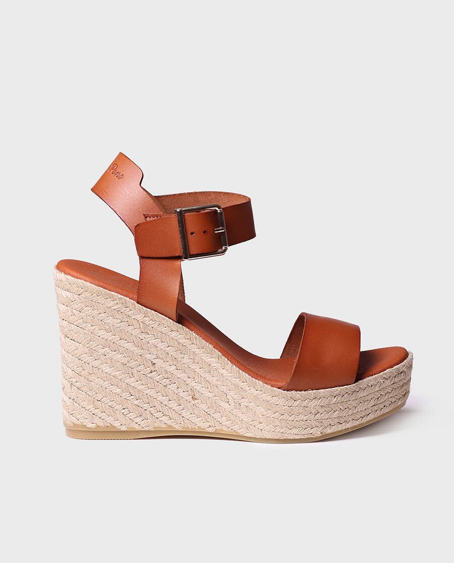 OLOT de Toni Pons. Alpercatas para mulher elaboradas em pele vaqueta de tons lisos. O cunha tem uma altura total de 11 cm dos quais 8 cm pertencem ao tacão e 3 cm à plataforma. Toda a cunha exterior está feita de juta e borracha. A planta interior está forrada em tecido respirável. Conta com um fecho de fivela que assegura uma fixação ao pé excecional.