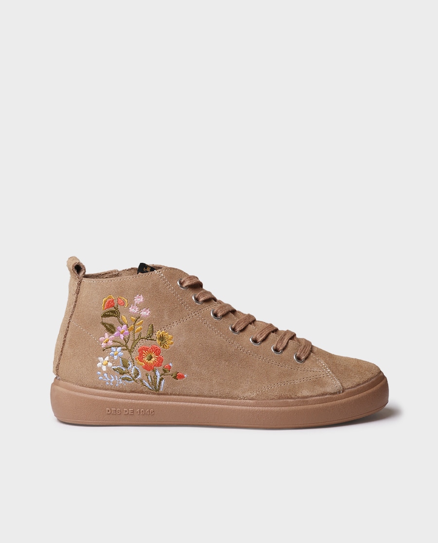 ORDIS. Este botim para mulher faz parte da cápsula Costa Brava. Está elaborado em camurça com detalhes de flores bordadas na lateral. Tem o design do clássico sapato de inverno abotinado com atacadores. A sola é plana, tem 2 cm de espessura e está feita de borracha antiderrapante. Tem um cómodo fecho de correr lateral como fecho. A palmilha interior está forrada em tecido e está acolchoada para maior conforto. Conta com um puxador posterior para facilitar a colocação. Este modelo calça o tamanho habitual, se estás entre dois números, escolhe um tamanho mais pequeno.