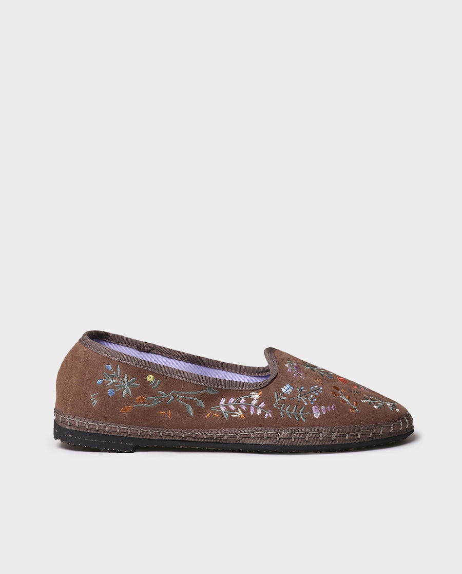 PEROLADA. Estas bailarinas para mulher fazem parte da cápsula Costa Brava. Estão elaboradas em camurça com detalhes de flores bordadas na lateral. Sua altura total é de 1 cm, e dispõe de uma palmilha interior forrada em tecido e está acolchoada para maior conforto. Este modelo calça o tamanho habitual, se estiver entre dois números, escolha um tamanho mais pequeno.