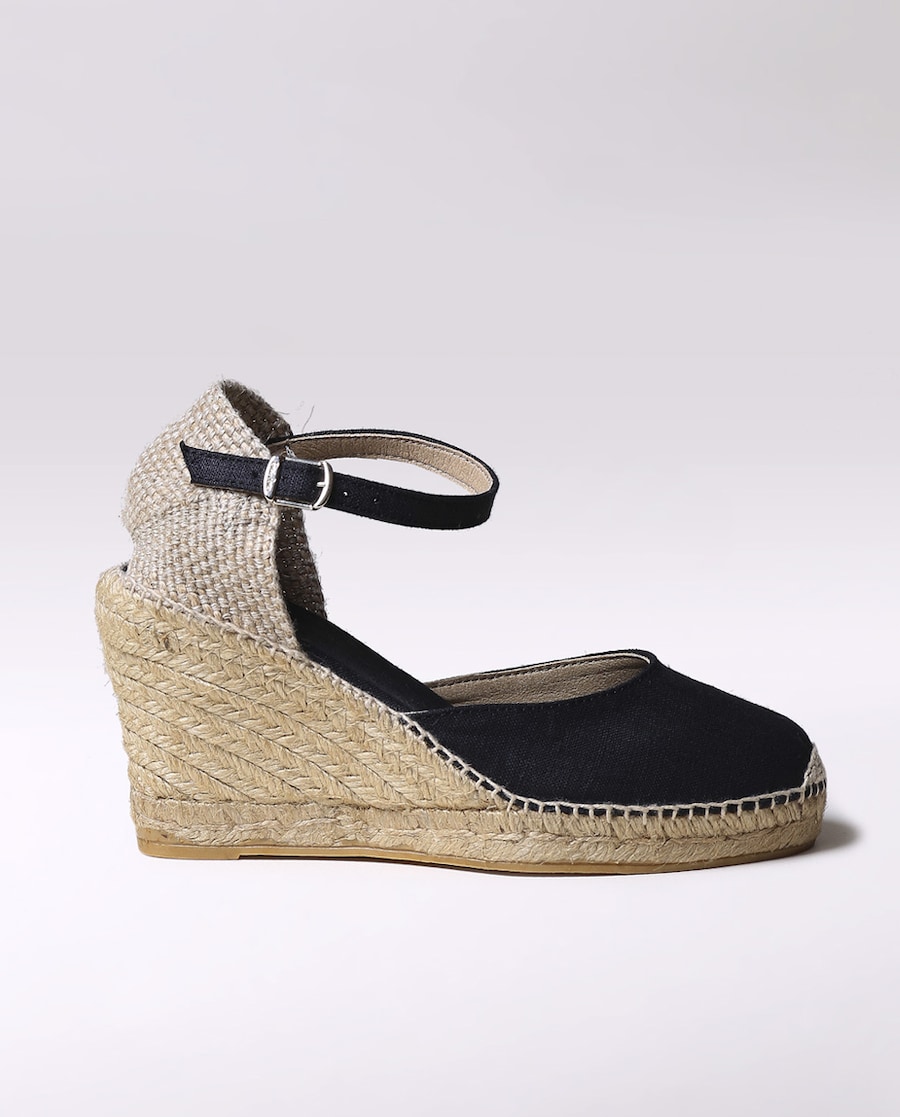 PORTBOU de Toni Pons. Alpercatas para mulher em linho, são elaboradas em tons lisos. O cunha tem uma altura total de 9 cm dos quais 7 cm pertencem ao tacão e 2 cm à sola. Toda a cunha exterior é feita de juta e borracha e a planta interior está forrada em tecido. A união do linho e da sola está cosida à mão com um fio de algodão e tem um reforço na ponta para maior sustentação. PORTBOU é o modelo clássico mais alto de Toni Pons, muito confortável apesar da sua altura. Pode usá-las em qualquer ocasião. O seu calcanhar de juta e algodão e o fecho de pulso ajustável lhe conferem um toque de elegância e sofisticação. A sua gama de cores permite combiná-las facilmente.