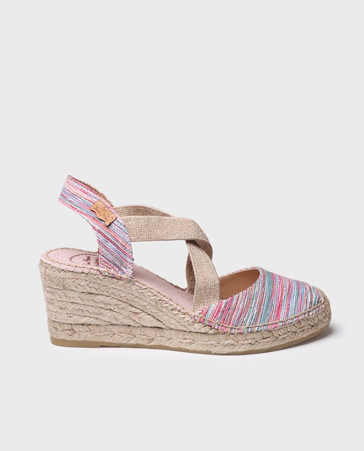 SABA-RG. Estas alpargatas com cunha estão elaboradas em tecido. A cunha de juta tem uma altura total de 7 cm, dos quais 5 cm pertencem ao tacão e 2 cm à sola. A base da sola é de borracha antiderrapante. A palmilha interior está forrada em tecido acolchoado o que lhe confere um grande conforto. Conta com duas tiras elásticas cruzadas na parte superior do pé para uma correta fixação. Trata-se de um design vegano 100% cosido à mão em Espanha. Este modelo calça o tamanho habitual, se estás entre dois tamanhos te recomendamos escolher o maior.