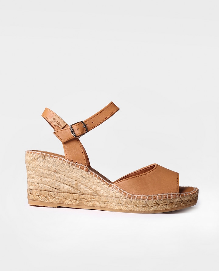 SIA-P. Estas alpargatas de cunha com fecho de fivela são elaboradas em pele. A cunha de juta tem uma altura de 7 cm, dos quais 5 cm pertencem ao tacão e 2 cm à plataforma. A base da sola é de borracha antiderrapante. A palmilha interior está forrada em pele de vaca para maior conforto. A união da pele e da sola está cosida à mão com um fio de algodão. A biqueira e o calcanhar são abertos. Este modelo calça o número habitual, se estiver entre dois números recomendamos escolher o maior.