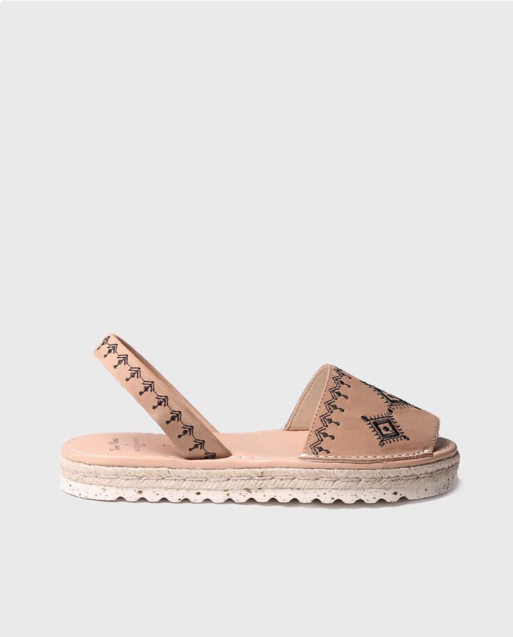 STAR. Estas alpargatas de pele para mulher fazem parte da coleção cápsula de Toni Pons & World Family Ibiza. Estão elaboradas em pele nubuck, com um bordado nativo em cor contrastante, que percorre toda a alpargata, desde a pala, até a tira posterior. A sola é plana, com uma trança de juta ao redor e tem uma altura total de 2 cm. A base da sola é de borracha antiderrapante. Este modelo calça o tamanho habitual, se estiver entre dois tamanhos recomendamos escolher o mais pequeno.