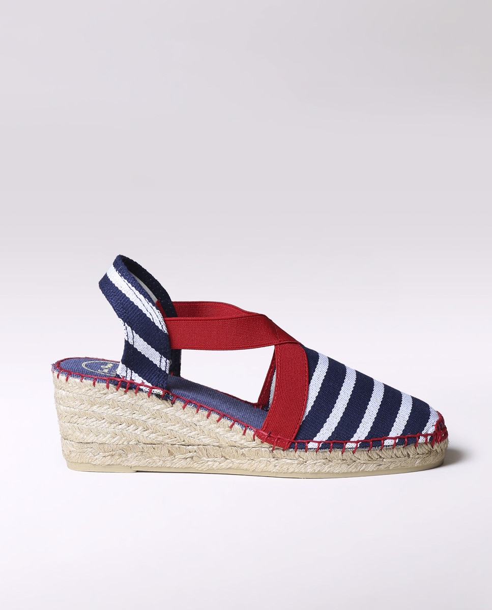 TARBES de Toni Pons. Alpercatas para mulher elaboradas em tecido de bandas às riscas. O cunha tem uma altura total de 6cm, dos quais, 4cm pertencem ao tacão e 2cm à sola. Toda a cunha exterior está feita de juta e borracha e a planta interior está forrada em tecido. A união do tecido e da sola está cosida à mão com um fio de algodão e tem um reforço na ponta para maior suporte. TARBES é um modelo de alpercatas extremamente confortável. Os elásticos de borracha cosidos ao tecido lhe conferem um suporte do pé excepcional. As bandas às riscas em diferentes cores dão alegria e um toque de diversão ao calçado. Um supervendas das nossas lojas.