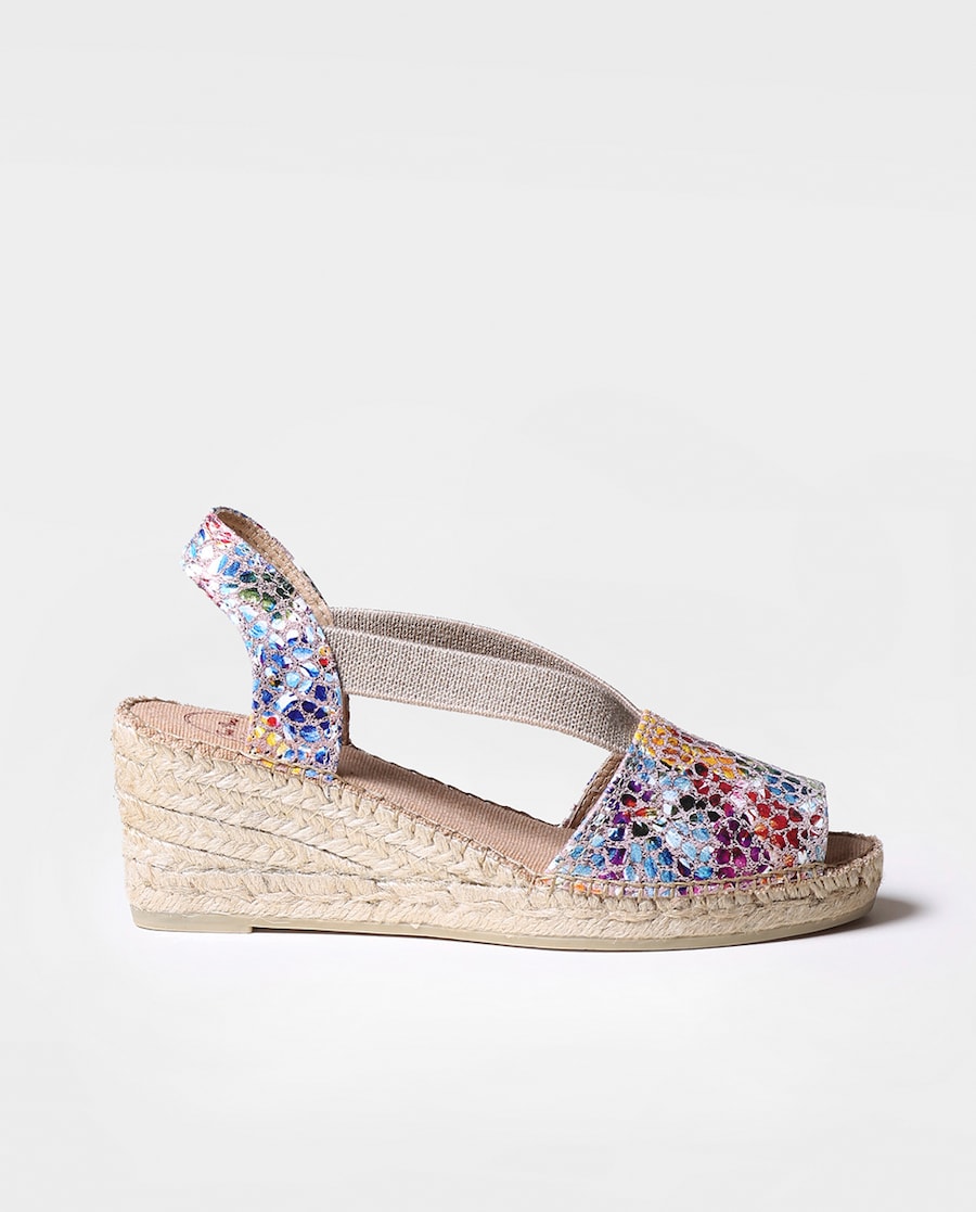 TEIDE-PM. Estas alpercatas de mulher estão elaboradas em pele com um estampado multicolor. A cunha de juta tem uma altura total de 6 cm, dos quais 4 cm formam parte do tacão e 2 cm da plataforma. A base da sola é de borracha antiderrapante. A palmilha interior está forrada em tecido de algodão. Conta com duas bandas elásticas laterais para uma perfeita sujeição ao pé. A união da pele e da sola está cosida à mão com um fio de algodão. Este modelo calça o tamanho habitual, se estás entre dois tamanhos te recomendamos escolher o maior.