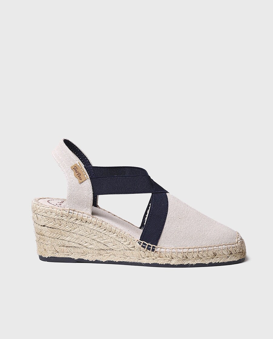 TERRA-BC de Toni Pons. Alpercatas para mulher elaboradas em algodão de tons lisos com elásticos em cor contrastante. O cunha tem uma altura total de 6 cm dos quais 4 cm pertencem ao tacão e 2 cm à sola. Toda a cunha exterior está feita de juta e borracha. A planta interior está forrada em tecido. A união do tecido e da sola está cosida à mão com um fio de algodão e tem um reforço na ponta para maior sustentação.