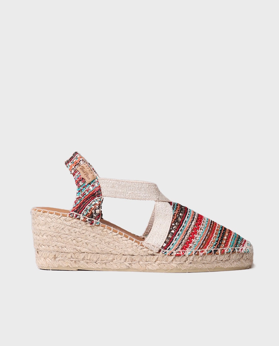 TERRA-CH. Estas alpargatas de mulher estão elaboradas em tecido multicolor. O cunha de juta tem uma altura total de 6 cm, dos quais 4 cm formam parte do tacão e 2 cm da plataforma. A base da sola é de borracha antiderrapante. A palmilha interior está forrada em pele. Conta com duas bandas elásticas para um perfeito ajuste ao pé. A união do tecido e da sola está cosida à mão com um fio de algodão. Este modelo calça o tamanho habitual, se estiver entre dois tamanhos recomendamos escolher o maior.