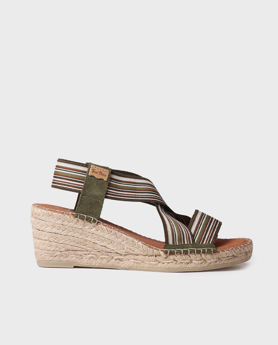 TINA. Alpercatas para mulher elaboradas com bandas elásticas e forro de têxtil respirável. O cunha tem uma altura total de 6 cm, dos quais 4 cm pertencem ao tacão e 2 cm à sola. Toda a cunha exterior está feita de juta e borracha. A palmilha interior está forrada em pele, o que lhe confere um grande conforto. A união do tecido e da sola está cosida à mão com um fio de algodão.