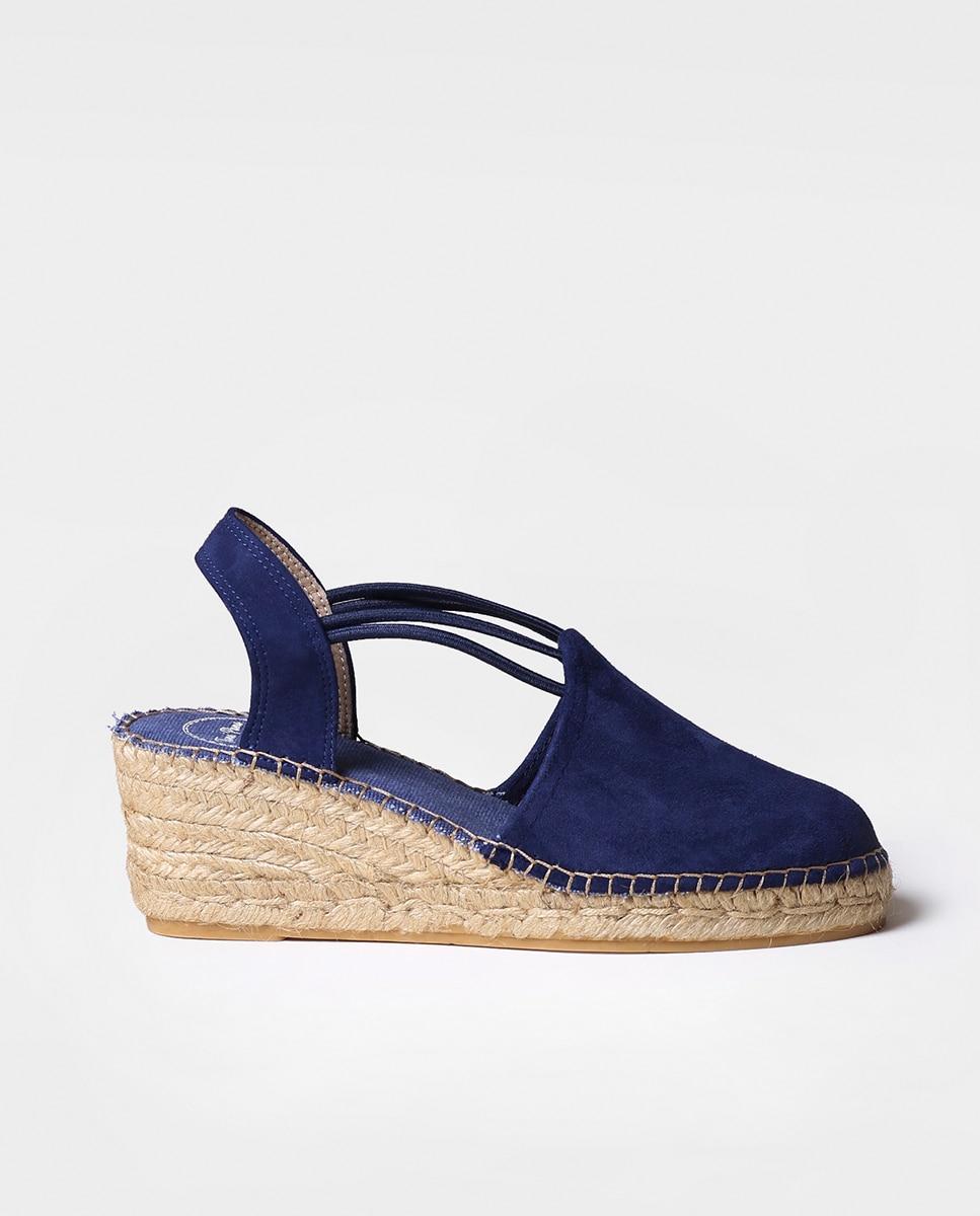 TREMP. Estas alpercatas de cunha com tiras elásticas estão elaboradas em camurça com forro de tecido transpirável. A cunha de juta tem uma altura total de 6 cm, dos quais 4 cm pertencem ao tacão e 2 cm à plataforma. A base da sola é de borracha antiderrapante e a sola interior está forrada em tecido. Esta sandália conta com umas tiras elásticas laterais que aportam uma grande sustentação ao pé. A união da camurça e da sola está cosida à mão com um fio de algodão. Este modelo calça o tamanho habitual, se estás entre dois tamanhos te recomendamos escolher o maior.