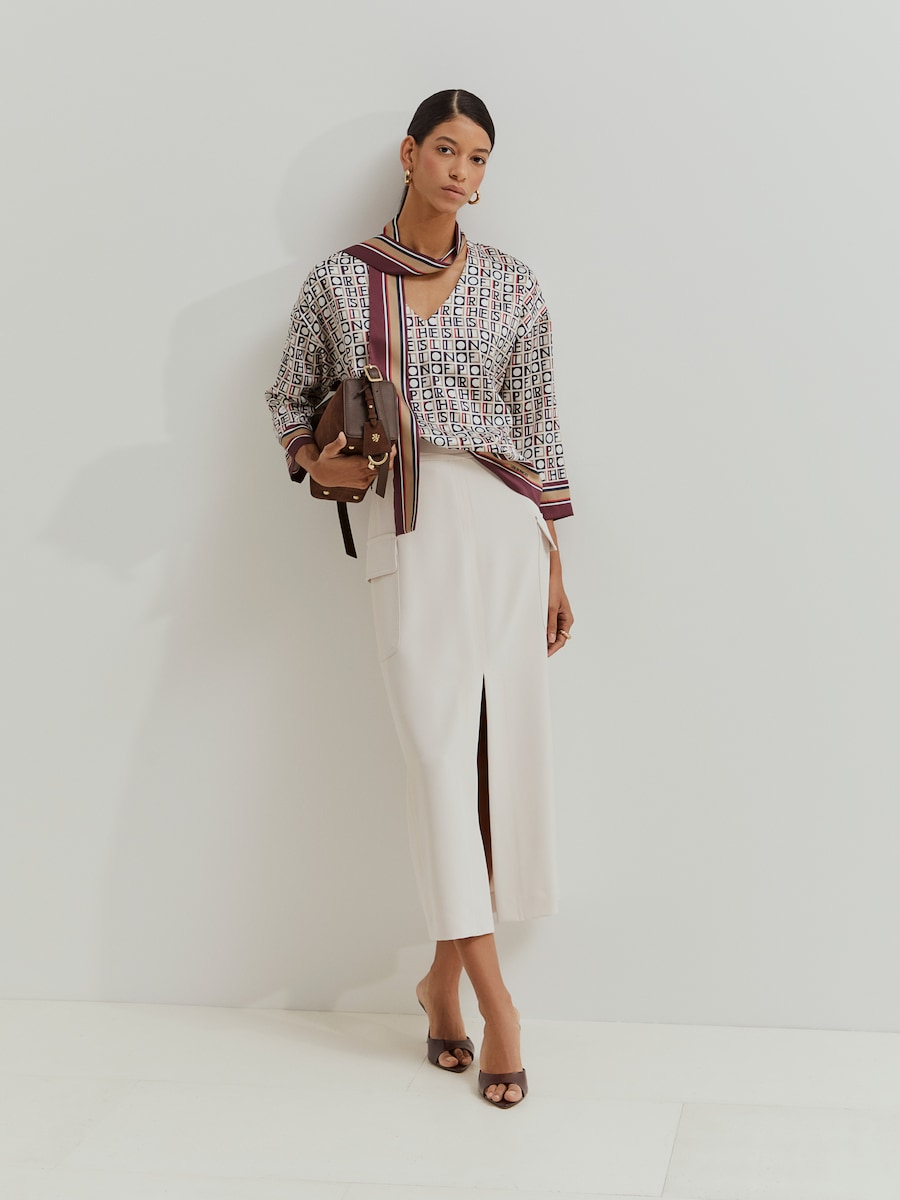 Elegante blusa fluída com um colorido estampado de leão de porches em toda a peça, perfeita para adicionar um toque de personalidade ao seu look. Manga comprida, decote em V e fita para atar ao pescoço.