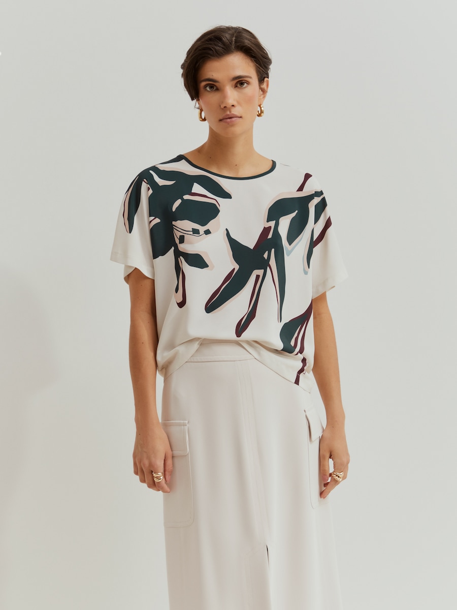 Blusa de manga curta morcego com estampado floral para um look casual e colorido. Com decote redondo em cor contraste. Fabricada com poliéster reciclado.