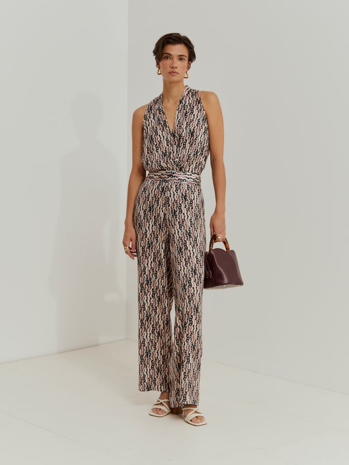 Calças palazzo com estampado integral. Fecham nas costas com fecho de correr oculto. Combinadas com o top sem mangas da mesma coleção, formam o conjunto perfeito para um look cheio de personalidade.