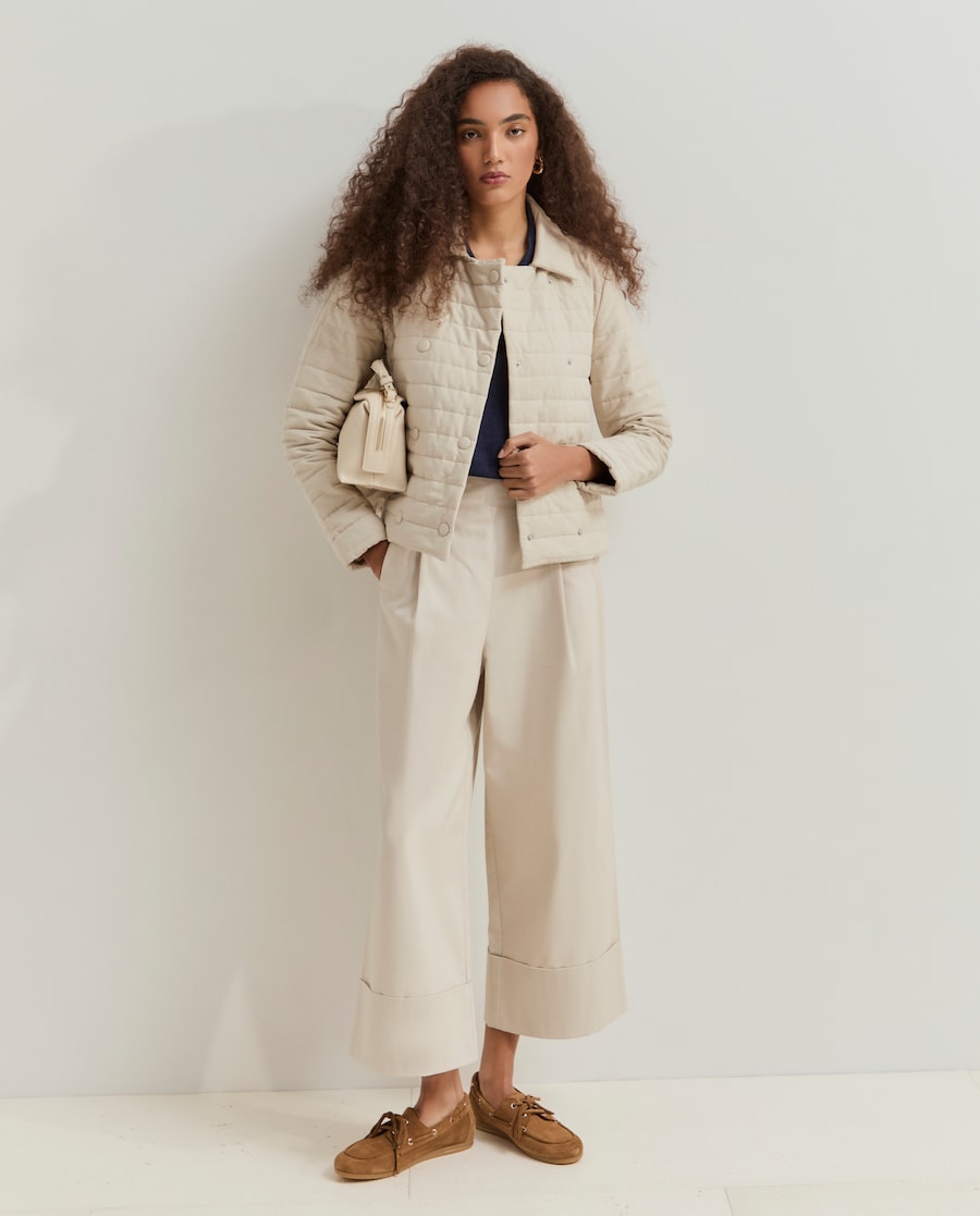 Casaco acolchoado com enchimento horizontal, desenhado para oferecer conforto e proteção nos dias mais frios. Apresenta fecho frontal com botões de pressão forrados no mesmo tecido, garantindo um acabamento cuidado e elegante. O interior conta com piping bicolor em contraste, adicionando um detalhe contemporâneo e exclusivo à peça.