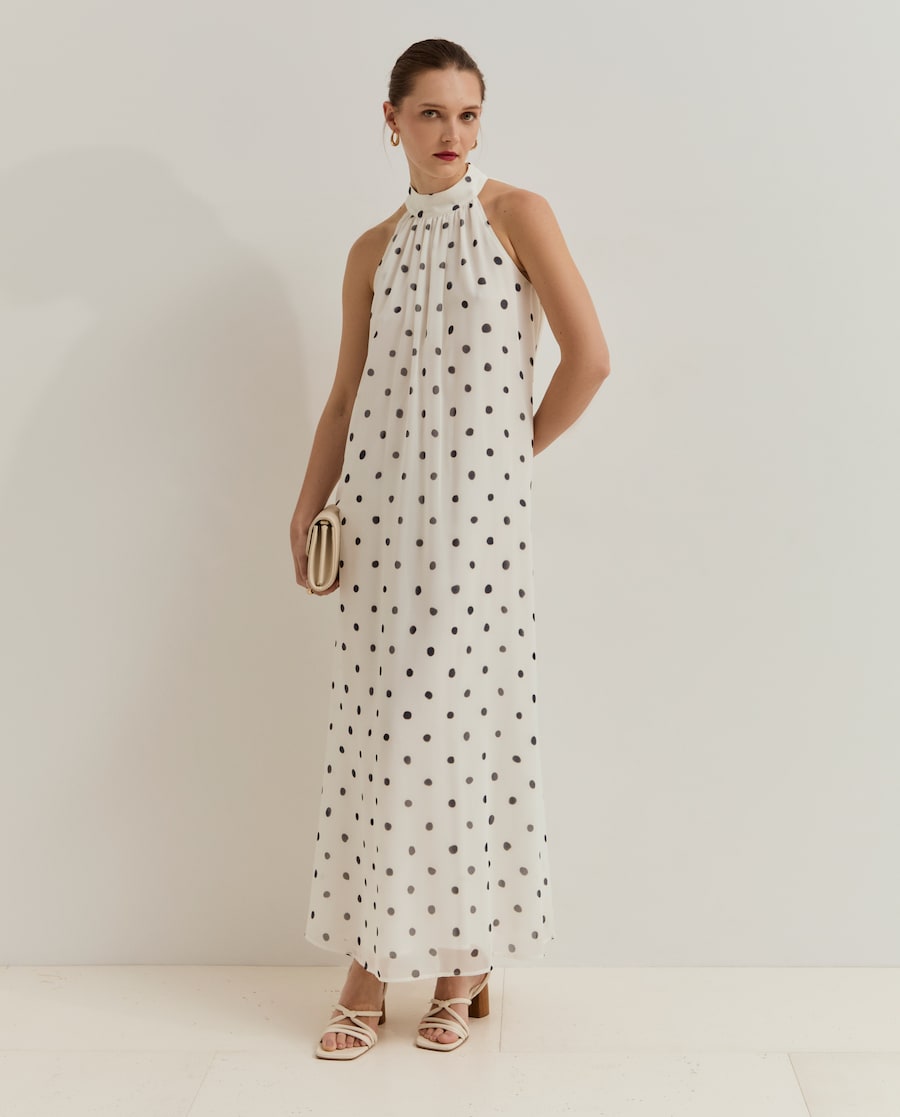 Vestido comprido sem mangas com decote halter. Confeccionado em tecido fluído com padrão de bolinhas sublimado. Permite usar com cinto para marcar a cintura e criar um caimento mais estruturado. Uma opção versátil, ideal para ocasiões especiais ou para um look elegante e descontraído.